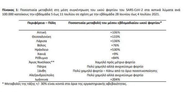 Οι αυξητικές μεταβολές κυμάνθηκαν από +76% στον Βόλο έως +530% στο Ηράκλειο. Αυξημένο κατά 106% ήταν το ιικό φορτίο στην Αττική, 133% στη Θεσσαλονίκη και 204% στα Ιωάννινα.