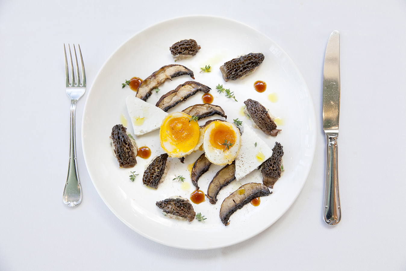 Μανιτάρια: Σε ένα τηγάνι γκριλ βάζουμε λίγο ελαιόλαδο και μια σκελίδα σκόρδο. Κόβουμε σε φέτες τα πορτομπέλο, αλατοπιπερώνουμε και τα ψήνουμε 3 λεπτά από κάθε πλευρά. Τα βγάζουμε. Συνεχίζουμε με τα σαμπινιόν ή τις μορχέλες. Τα ψήνουμε περίπου 3 λεπτά από κάθε πλευρά και τα βγάζουμε. Τηγανίζουμε τα ήδη παναρισμένα αβγά στους 170°C, να πάρουν χρώμα, για 3 λεπτά σε φριτέζα ή κατσαρόλα.