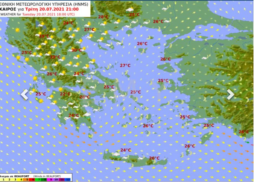 Στην Αττική την Τρίτη 20 Ιουλίου 2021 περιμένουμε λίγες νεφώσεις οι οποίες τις θερμές ώρες της ημέρας θα πυκνώσουν και είναι πιθανό να εκδηλωθούν όμβροι ή καταιγίδες κυρίως στα βόρεια. Οι άνεμοι θα πνέουν από νότιες κυρίως διευθύνσεις με εντάσεις 2-3 μποφόρ. Η θερμοκρασία θα κυμανθεί από 21 έως 35 βαθμούς.