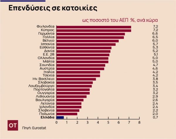 Τα σχεδόν 24 δισ. ευρώ που χάθηκαν λόγω της συρρίκνωσης των επενδύσεων σε κατοικίες μείωσαν δραματικά τις συνολικές επενδύσεις για κατασκευαστικά έργα, με αποτέλεσμα η Ελλάδα να καταγράφει το χαμηλότερο ποσοστό επενδύσεων σε κατασκευές ως ποσοστό του ΑΕΠ μεταξύ των χωρών της ΕΕ, στο ήμισυ σχεδόν από την προτελευταία χώρα (Ιρλανδία).