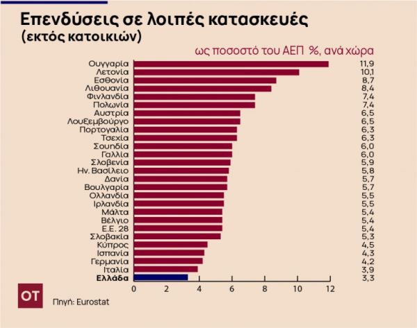 Είναι χαρακτηριστικό ότι στις λοιπές επενδύσεις σε κατασκευές σημειώθηκε πτώση κατά 38% από το υψηλό που κατέγραψαν το 2009. Οι επενδύσεις σε αυτή την κατηγορία διαμορφώθηκαν το 2019 σε 6,4 δισ. ευρώ, έναντι 7,3 δισ. ευρώ κατά μέσο όρο την περίοδο 2010-2019.
