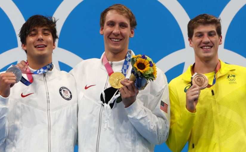 Ο αμερικανός Τσέις Κάλιζ έβγαλε τη μάσκα του στο βάθρο των νικητών, μετά την κατάκτηση της πρώτης θέσης στα 400μ. μεικτής ατομικής ανδρών, αγκαλιάζοντας τον συμπατριώτη του, Τζέι Λίδερλαντ, ο οποίος με 4:10.28 πήρε τη δεύτερη θέση και το ασημένιο μετάλλιο.