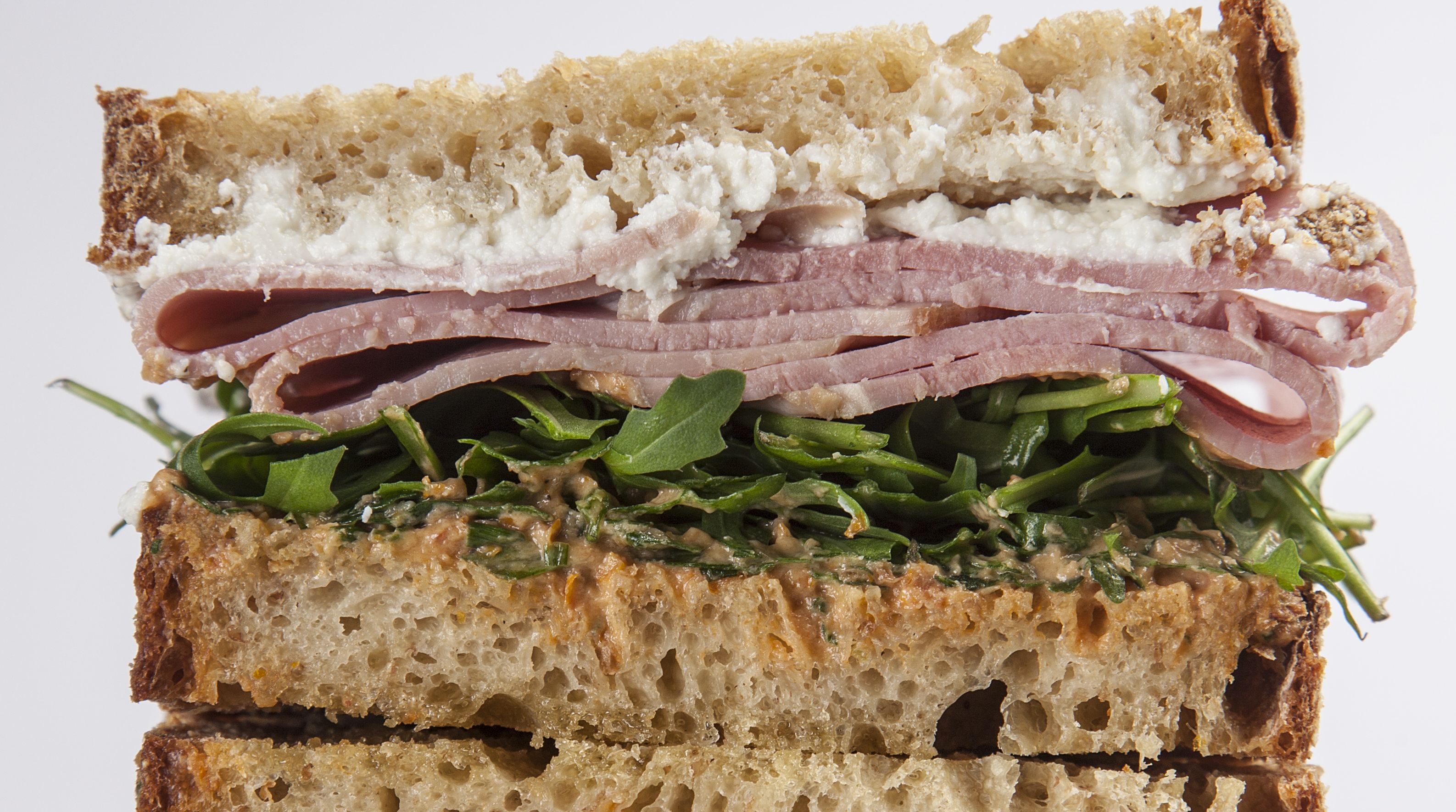 Πάνω στις φέτες με το κατσικίσιο τυρί τοποθετούμε το νουά και από πάνω τα φύλλα ρόκας. Κλείνουμε το σάντουιτς με τη φέτα του ψωμιού στην οποία έχουμε απλώσει το άλειμμα λιαστής ντομάτας και επαναλαμβάνουμε την ίδια διαδικασία με το δεύτερο σάντουιτς.