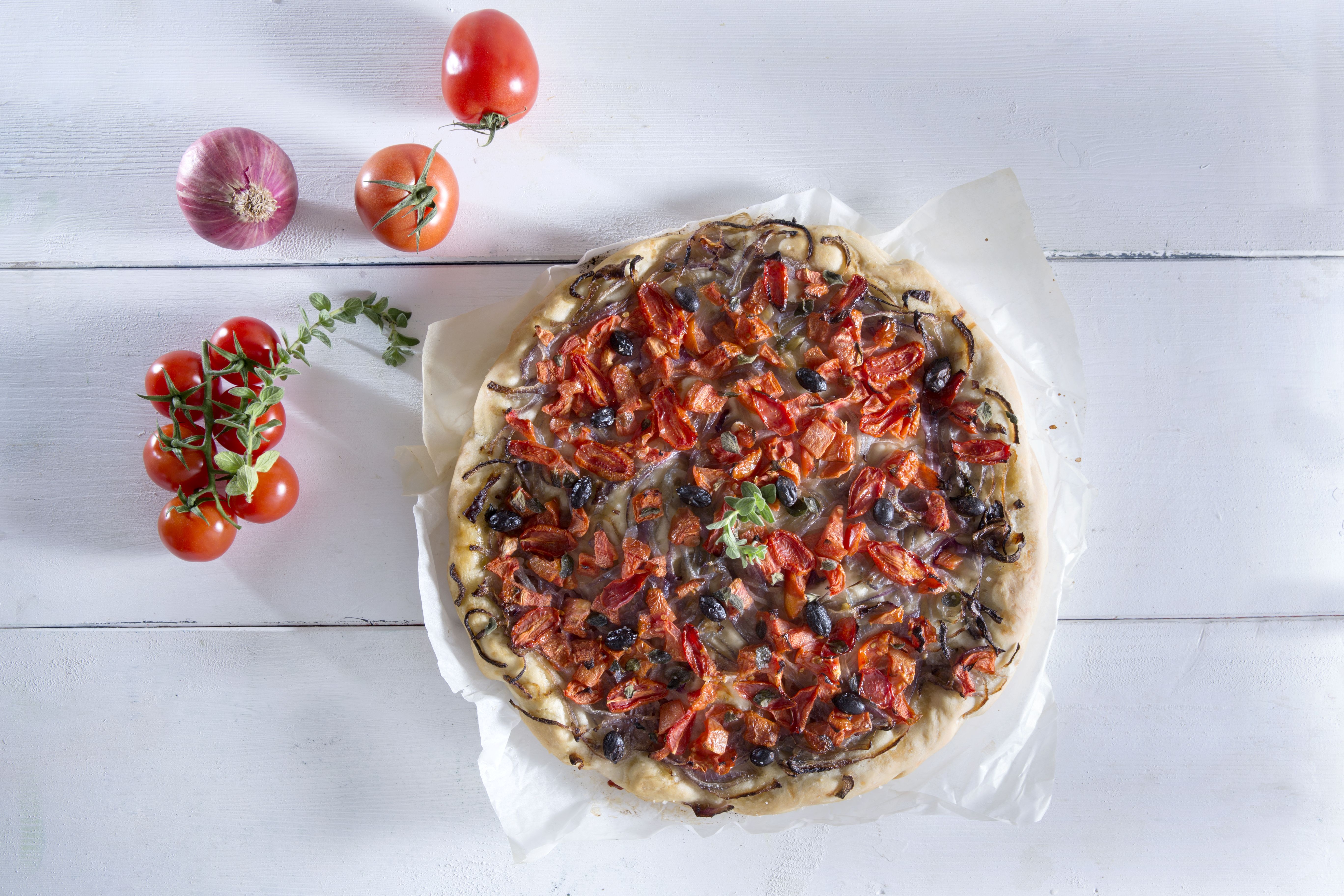 Προθερμαίνουμε το φούρνο στους 200ο C. Ξεσκεπάζουμε τη ζύμη, απλώνουμε στην επιφάνεια της τα κρεμμύδια, τις ψιλοκομμένες ντομάτες και τα ντοματίνια. Προσθέτουμε τη ρίγανη, χοντρό θαλασσινό αλάτι και πιπέρι. Περιχύνουμε με λίγο ελαιόλαδο (1-2 κ.σ.) .