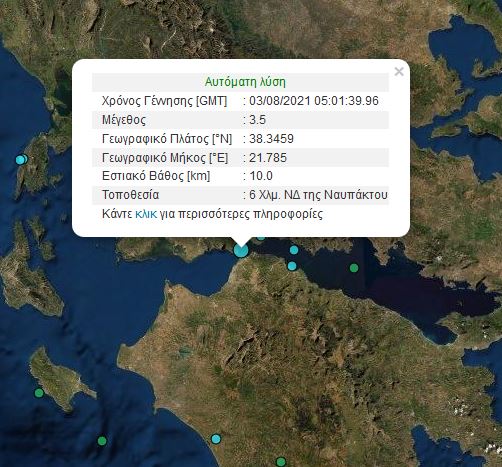 Σύμφωνα με την αυτόματη λύση του Γεωδυναμικού Ινστιτούτου του Εθνικού Αστεροσκοπείου Αθηνών, ο σεισμός είχε μέγεθος 3,5 βαθμών της κλίμακας Ρίχτερ και το επίκεντρο εντοπίστηκε έξι χιλιόμετρα νοτιοδυτικά της Ναυπάκτου, ενώ το εστιακό βάθος προσδιορίστηκε στα 10 χιλιόμετρα.