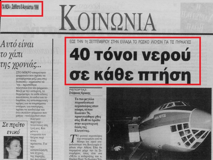 Αμφιβολίες για την αποτελεσματικότητα του ρωσικού ιπτάμενου μεγαθηρίου «Ιλιούσιν» που στελνει η Ρωσία στην χώρα μας, και το οποίο έχει την δυνατότητα ρίψης 40 τόνων νερού εκφράζουν, μιλώντας προς «Το Βήμα» πρώην και νυν στελέχη της Πυροσβεστικής . Κι αυτό με βάση την εμπειρία από την διετή παρουσία στην Ελλάδα τέτοιου είδους γιγαντιαίου αεροσκάφους την διετία 1998-1999. Με την ελπίδα ωστόσο ότι αυτή την φορά θα υποβοηθήσει στον περιορισμό των πύρινων μετώπων που κατακαίουν την χώρα και με τον φόβο εκδήλωσης νέων καταστροφικών πυρκαγιών .