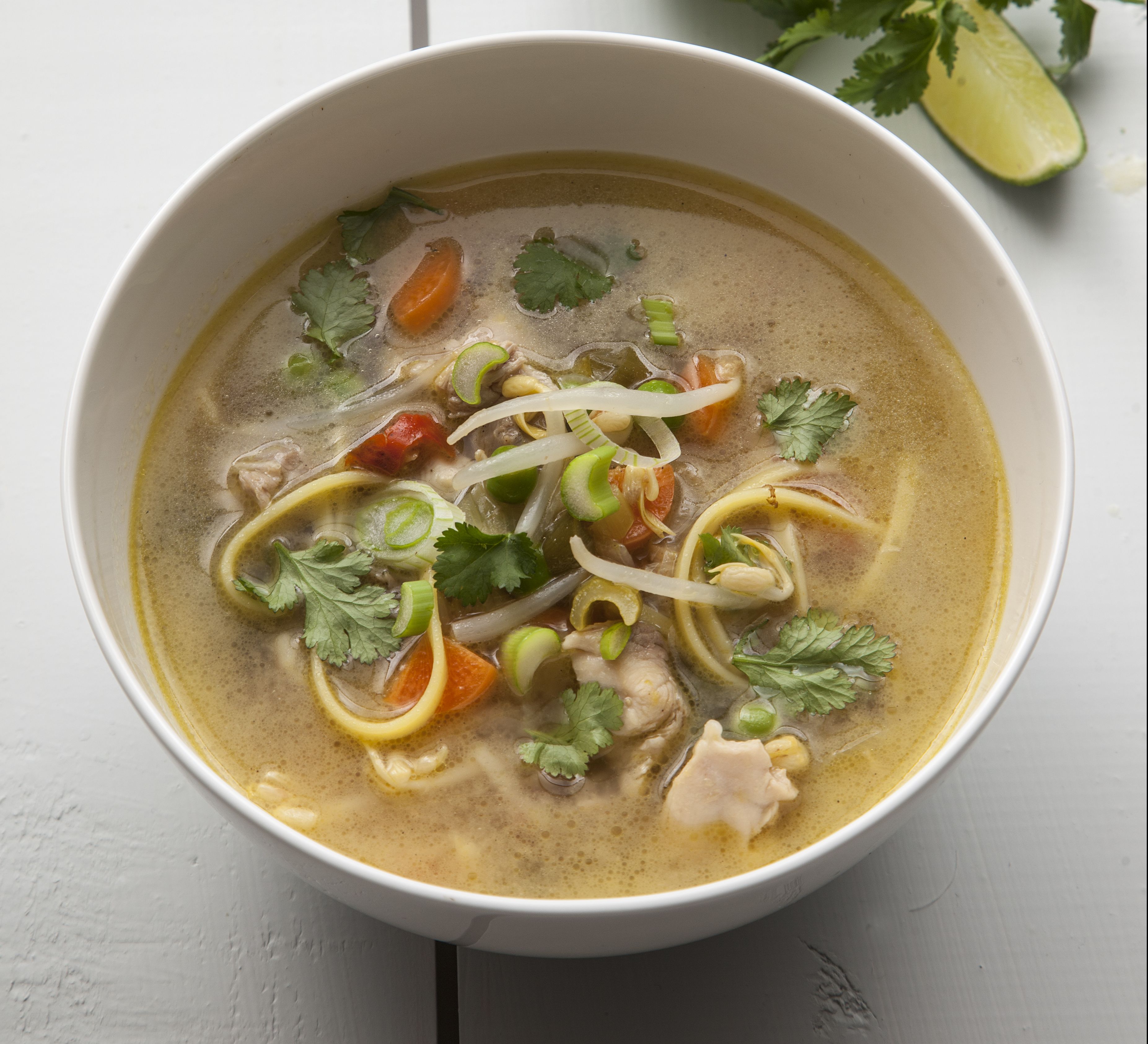 Σε μία κατσαρόλα ρίχνουμε το σησαμέλαιο προσθέτουμε το κοτόπουλο να γυαλίσει για 3 λεπτά, προσθέτουμε το κρεμμυδάκι, το σκόρδο ,την πάστα από κάρυ , το τζίντζερ. Ανακατεύουμε καλά και ρίχνουμε όλα τα υπόλοιπα υλικά εκτός από τα noodles. Βράζουμε την σούπα για 15-20 λεπτά και προσθέτουμε τα noodles σπασμένα. Σβήνουμε την φωτιά και αφήνουμε για 10 λεπτά να φουσκώσουν. Σερβίρουμε με ψιλοκομμένο φρέσκο κόλιανδρο και έξτρα χυμό μοσχολέμονου.