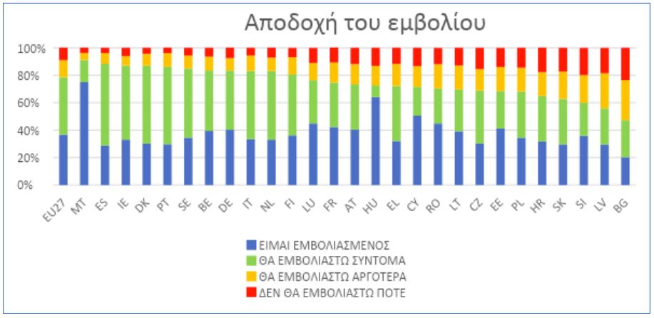 Για να καταγράψουμε την προθυμία των πολιτών της ΕΕ να εμβολιαστούν κατά του COVID-19, οι ερωτηθέντες προσκλήθηκαν να απαντήσουν στο ερώτημα πότε θα ήθελαν να εμβολιαστούν. Η πλειονότητα των ερωτηθέντων έχει ήδη εμβολιαστεί ή θα ήθελαν να εμβολιαστούν το συντομότερο δυνατό (69%). Το ποσοστό αυτό για την Ελλάδα είναι 59%.