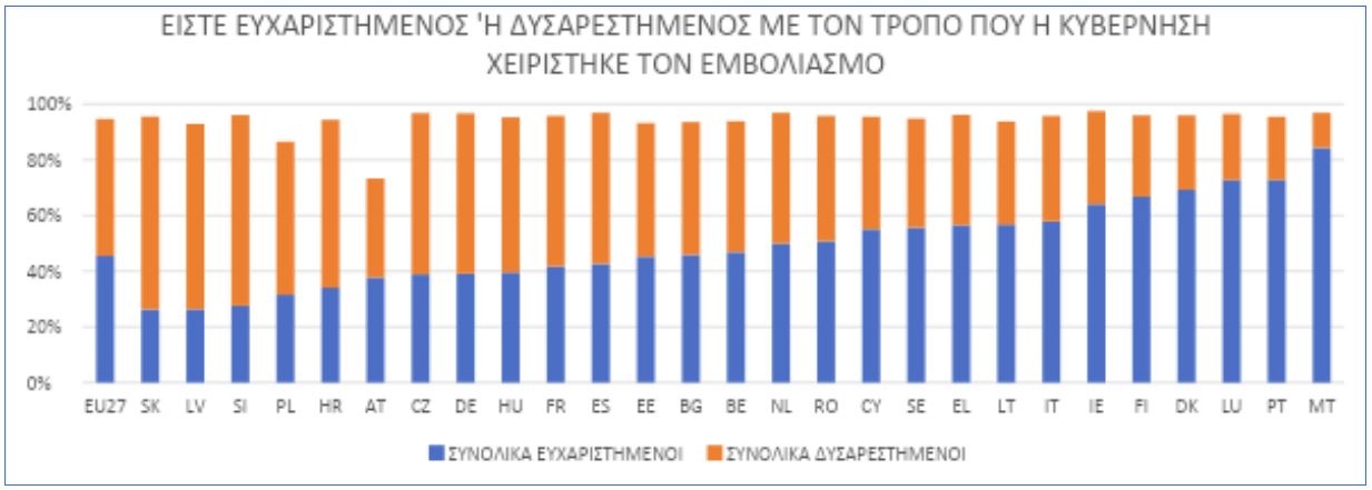 Η πλειοψηφία των Ελλήνων (57%) δηλώνουν πως είναι ευχαριστημένοι με την στρατηγική της Κυβέρνησης για τον εμβολιασμό. Το αντίστοιχο ποσοστό σε Ευρωπαϊκό επίπεδο είναι 46%. Οι δυσαρεστημένοι στην Ελλάδα είναι 40% ενώ το αντίστοιχο ποσοστό στην Ευρωπαϊκή Ένωση είναι είναι 49%. Η κατάταξη της Ελληνικής Κυβέρνησης είναι στις 10 πρώτες θέσεις.