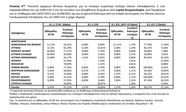 Σύμφωνα με τα στοιχεία του ΕΟΔΥ, ο έλεγχος στη διάρκεια του Ιουλίου (2.7-31.7.2021) ανέδειξε 823 δείγματα με παραλλαγές ανησυχίας, 24 με παραλλαγές υπό παρακολούθηση και τρία δείγματα με παραλλαγές ενδιαφέροντος.