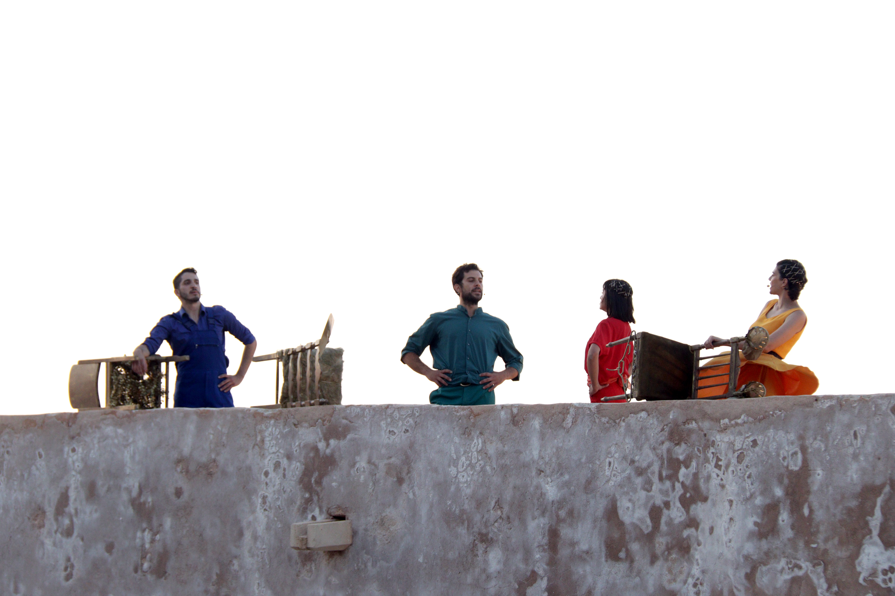 Πέντε ηθοποιοί, δύο γυναίκες και τρεις άντρες, ντυμένοι με διαφορετικές αλλά ταιριαστές μονοχρωμίες, περιεργάζονταν για ώρα εκείνες τις καρέκλες, κατά μόνας, σαν να επιδίδονταν σε έναν βουβό αλλά έντονο διάλογο με τα ίδια τα πράγματα, κι ύστερα όλοι μαζί συσπειρώθηκαν προς το κέντρο, κοντά σε μια θολωτή πύλη, ένα πέρασμα το οποίο ενέτεινε την εντύπωση, ενόσω το δειλινό προχωρούσε, ότι ο χρόνος επρόκειτο να αλλάξει, να γίνει επικός. Και τότε, μέσα από μια χοάνη φωνών, συνωθούμενων και μάλλον αμφίβολων, επαναληπτικών και σπασμωδικών, υψώνεται μία και μας εγκαθιστά στην επικράτεια του μύθου. «Τραγούδα το θυμό, θεά, του γόνου του Πηλέα,/ τον ερημοκατάρατο, που μπήκε τ’ Αχιλλέα […]». Ομήρου Ιλιάδα, ραψωδία Α, σε μετάφραση Γεωργίου Ψυχουντάκη.
