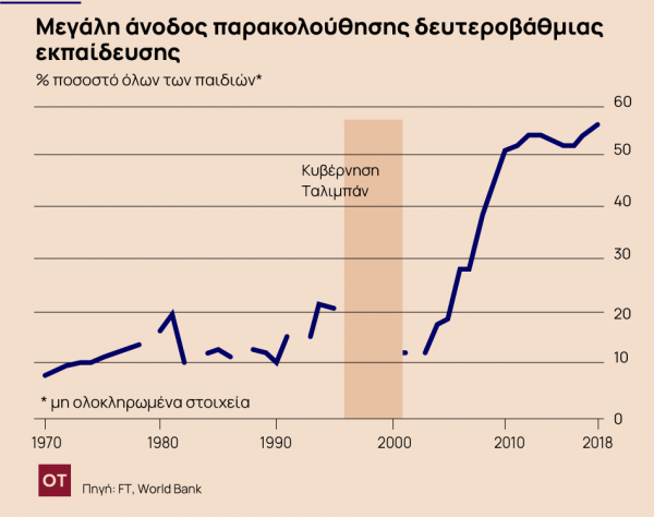 Η εκπαιδευτική απόδοση βελτιώθηκε επίσης σημαντικά. Υπάρχουν περίπου 8,2 εκατομμύρια περισσότερα παιδιά στο σχολείο σε σχέση με το 2001, και το ποσοστό των παιδιών που εγγράφονται στη δευτεροβάθμια εκπαίδευση αυξήθηκε από 12 % το 2001 σε 55% το 2018.