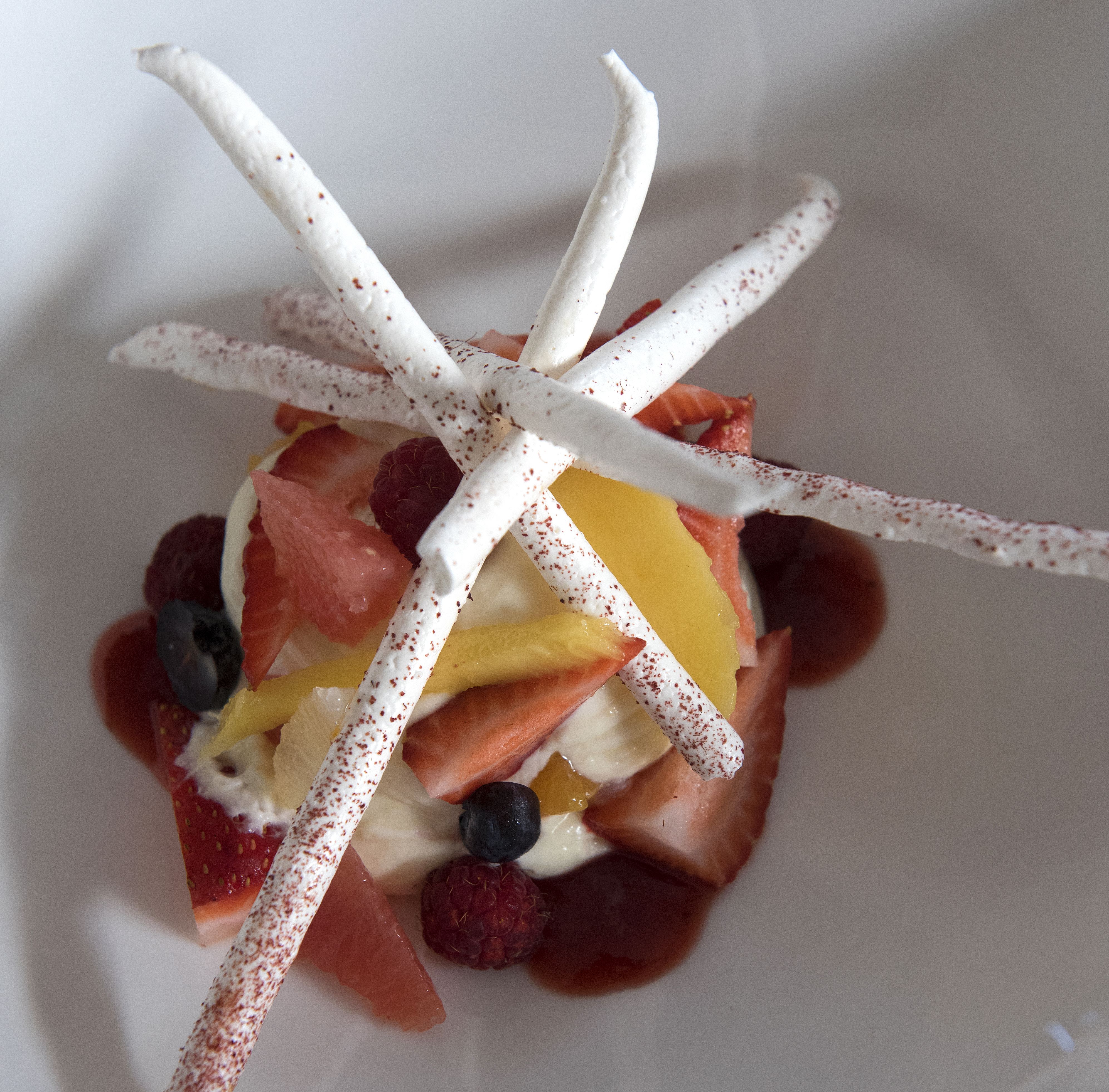 Βάζουμε σε ένα βαθύ πιάτο 2 κ.σ. από την κρέμα και 1 κ.σ. από τα φρούτα. Επαναλαμβάνουμε. Στολίζουμε από πάνω με μαρέγκες.