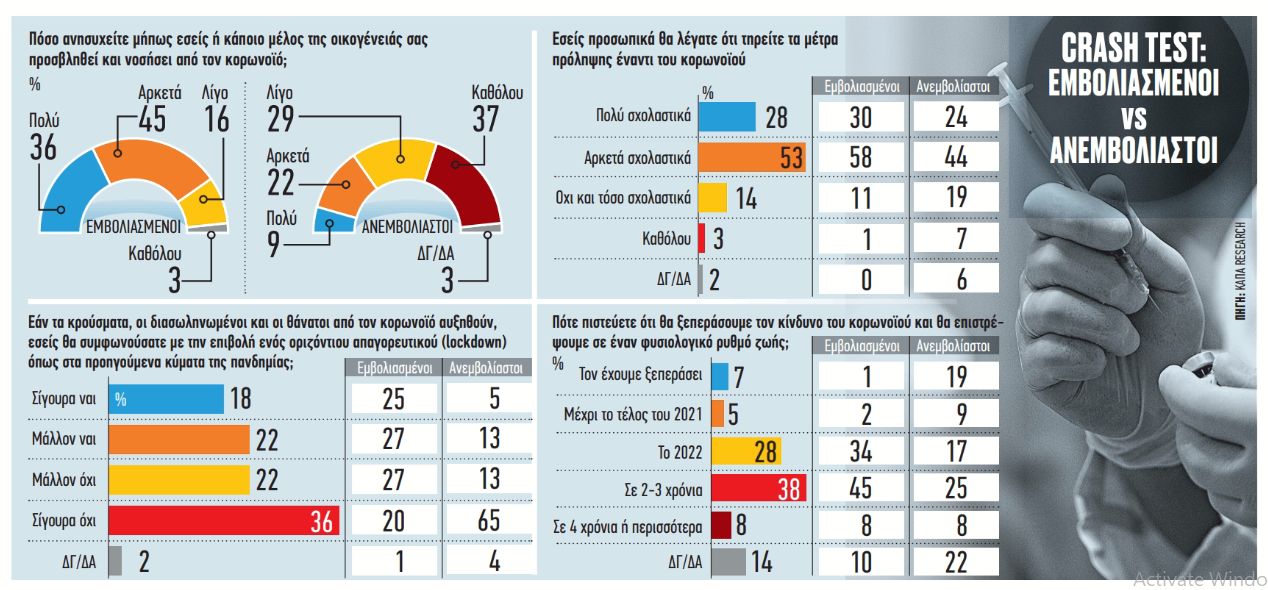 Εάν δε σε αυτούς προστεθούν και εκείνοι που απαντούν «μάλλον όχι» ή «δεν γνωρίζω/δεν απαντώ», τότε το αντίστοιχο ποσοστό σκαρφαλώνει στο 16%, δημιουργώντας μια σημαντική «μαύρη τρύπα» στο επιδιωκόμενο τείχος ανοσίας.