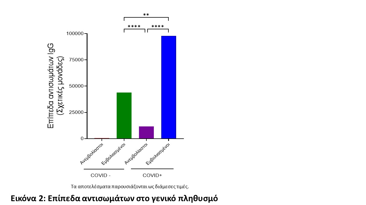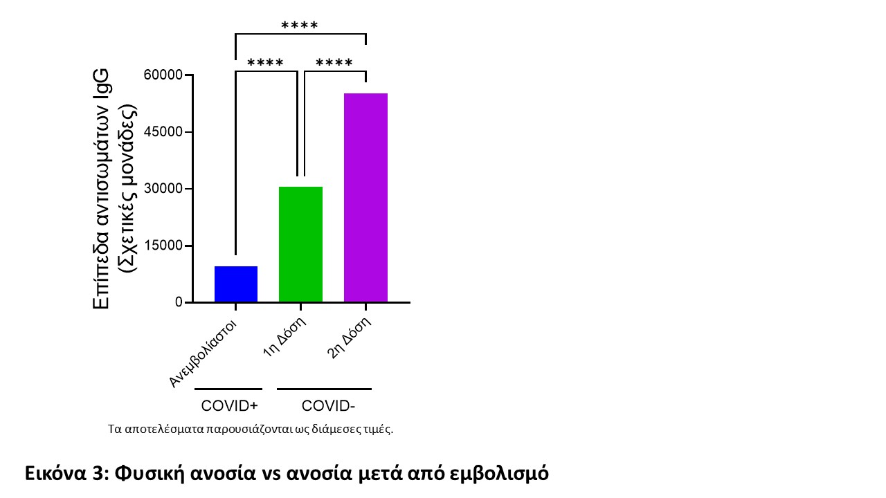 Τα αποτελέσματα αναδεικνύουν μια σημαντική διαφορά στα επίπεδα αντισωμάτων που επιτυγχάνονται μεταξύ φυσικής νόσησης και εμβολιασμού. Ο εμβολιασμός με οποιοδήποτε από τα εγκεκριμένα εμβόλια στην Κύπρο οδηγεί στην παραγωγή σημαντικά υψηλότερων τιμών αντισωμάτων παρά από τη φυσική νόσηση και ενδεχομένως υψηλότερη χυμική ανοσία (Εικόνα 2) σε όλες τις ηλικιακές ομάδες που μελετήθηκαν. Εξίσου σημαντική είναι και η παρατήρηση ότι ο εμβολιασμός μετά από νόσηση έχει ως αποτέλεσμα την παραγωγή εξαιρετικά υψηλών επιπέδων αντισωμάτων στα άτομα αυτά, γεγονός που καταδεικνύει τη σημασία του εμβολιασμού ακόμα και ατόμων που έχουν νοσήσει στο παρελθόν (Εικόνα 2).