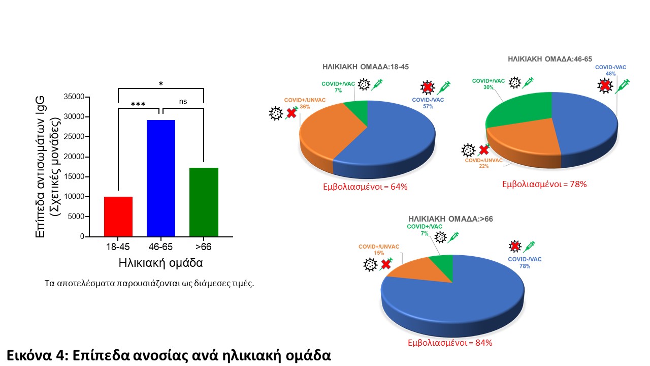 Η αύξηση των επιπέδων αντισωμάτων μετά τον εμβολιασμό φαίνεται και από τα επίπεδα αντισωμάτων στις νεαρές ηλικιακές ομάδες στις οποίες παρόλο που το ποσοστό νόσησης είναι υψηλό, τα αντισώματα παραμένουν χαμηλά σε σύγκριση με τις μεγαλύτερες ηλικιακές ομάδες και αυτό ενδεχομένως συμβαίνει λόγω του χαμηλότερου ποσοστού εμβολιασμού σε αυτή την ηλικιακή ομάδα (Εικόνα 4).