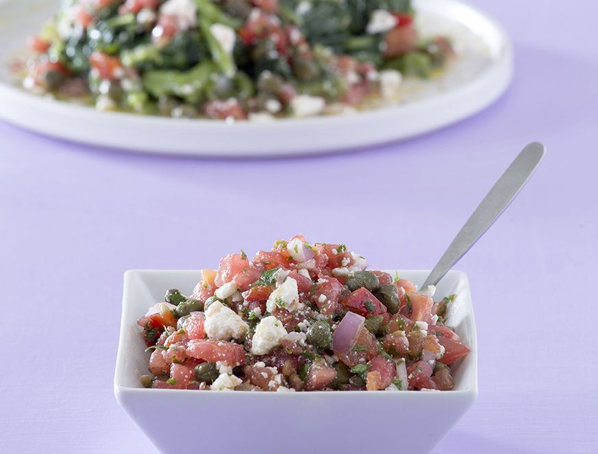 Ψιλοκόβουμε τον μαϊντανό, το κρεμμύδι, την πιπεριά και το σκόρδο (αν βάλουμε) και προσθέτουμε αλάτι (με προσοχή γιατί η κάππαρη, το τυρί και οι ντομάτες ήδη έχουν), πιπέρι, το ελαιόλαδο και την κάππαρη. Ανακατεύουμε.