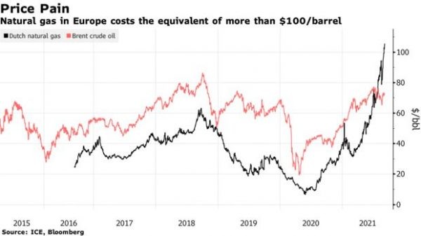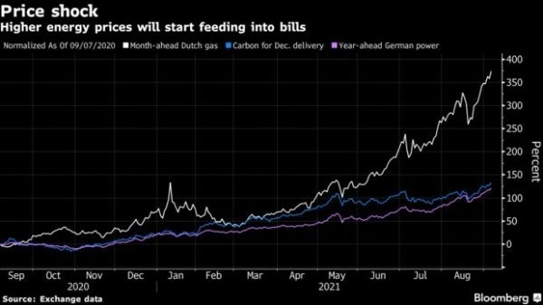 Για σοκ από τη μια άκρη της Ευρώπης μέχρι την άλλη, εξαιτίας των επιπέδων ρεκόρ που καταγράφουν οι τιμές του φυσικού αερίου και της ηλεκτρικής ενέργειας, κάνει λόγο το Bloomberg.