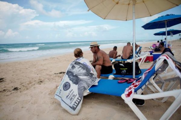 A tourist wears a towel with the design of a U.S. $100 bill at Santa Maria beach on the outskirts of Havana, Cuba, September 11, 2019. Picture taken on September 11, 2019. REUTERS/Alexandre Meneghini