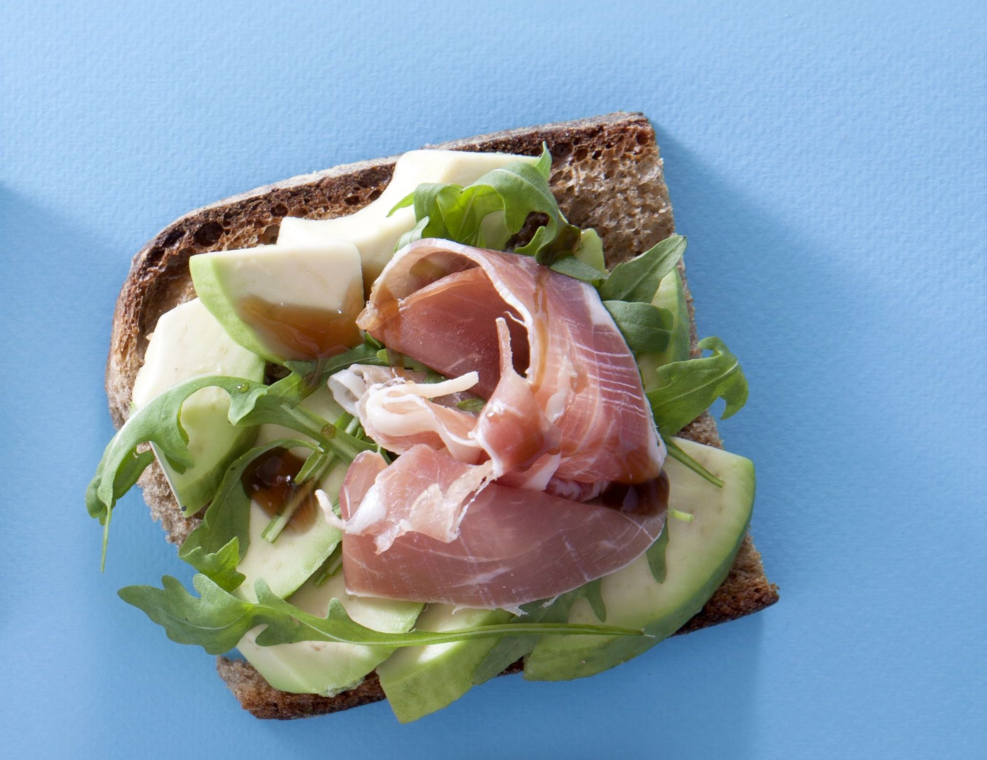 Καθαρίζουμε το αβοκάντο, αφαιρούμε το κουκούτσι, το κόβουμε σε φέτες και πάνω τους στύβουμε λίγο χυμό λεμόνι για να μη μαυρίσουν. Τοποθετούμε όμορφα τις φέτες του αβοκάντο πάνω στο ψωμί. Πάνω σε κάθε φέτα βάζουμε μερικά φυλλαράκια ρόκας και από πάνω 1 φέτα προσούτο. Προσθέτουμε περίπου ένα κουταλάκι του γλυκού από το ντρέσινγκ πάνω σε κάθε φέτα.