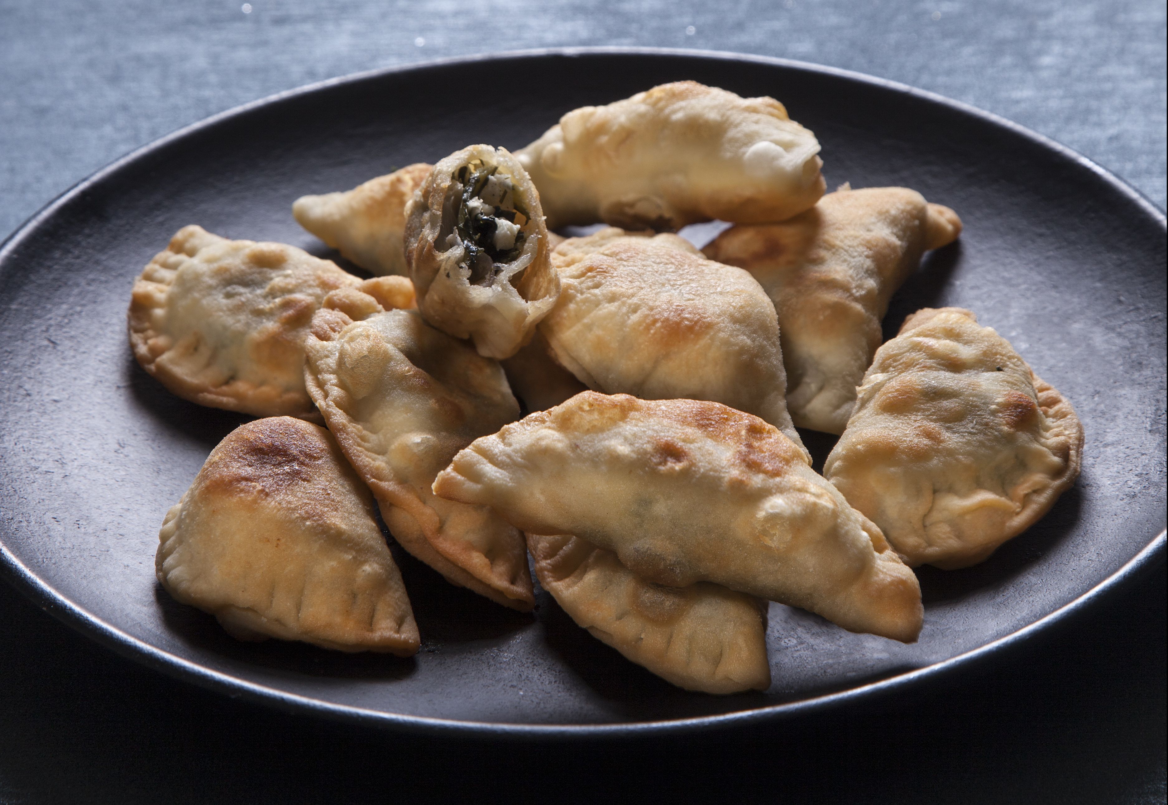 Φύλλο: Χτυπάμε όλα τα υλικά μαζί στο μίξερ, με τον γάντζο, έως ότου έχουμε μια απαλή και ελαστική ζύμη. Αν δεν έχουμε μίξερ, κάνουμε σε έναν καθαρό πάγκο ένα βουναλάκι από το αλεύρι. Ανοίγουμε μια λακκούβα στη μέση και ρίχνουμε εκεί τα υλικά ένα-ένα. Ζυμώνουμε με τα χέρια. Τυλίγουμε τη ζύμη, είτε τη φτιάξαμε στο μίξερ είτε με τα χέρια, με μεμβράνη και την αφήνουμε να ξεκουραστεί για 15 λεπτά. Τη μοιράζουμε σε 4 μπαλάκια τα οποία ανοίγουμε σε φύλλα με έναν πλάστη. Με ένα πιατάκι του καφέ ή ένα κουπάτ κόβουμε τα φύλλα σε δίσκους. Στο μισό μέρος του δίσκου βάζουμε λίγη από τη γέμιση και διπλώνουμε από πάνω το άλλο μισό, έτσι ώστε να σχηματίσουμε ένα μισοφέγγαρο. Ενώνουμε τις άκρες πιέζοντάς τες περιμετρικά με ένα πιρούνι. Ρίχνουμε μπόλικο ελαιόλαδο σε ένα τηγάνι και το τοποθετούμε σε μέτρια προς δυνατή φωτιά. Μόλις κάψει το λάδι, τηγανίζουμε και από τις δύο πλευρές μέχρι να ροδίσουν και να βεβαιωθούμε ότι είναι ψημένο φύλλο το φύλλο (περίπου 5 λεπτά από την κάθε πλευρά).