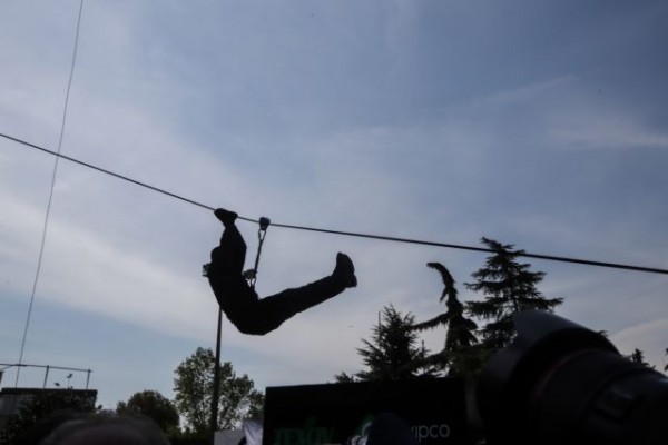 Πέντε στελέχη, με τον κατάλληλο εξοπλισμό και σε άρτιο συντονισμό, καταρριχήθηκαν με ταχύτητα από μεγάλο ύψος, καθηλώνοντας τόσο τον πρωθυπουργό όσο και τον κόσμο που τους παρακολουθούσε.