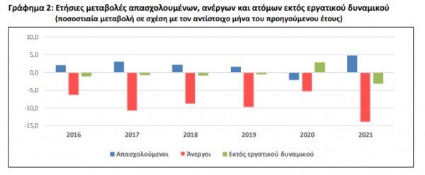 Ειδικότερα, σύμφωνα με την ΕΛΣΤΑΤ, το εποχικά διορθωμένο ποσοστό ανεργίας τον Ιούλιο του 2021 ανήλθε σε 14,2% έναντι του διορθωμένου προς τα άνω 16,8% τον Ιούλιο του 2020 και του 15,0% τον Ιούνιο του 2021.