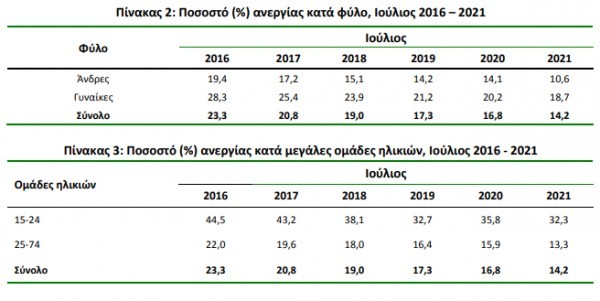 Στις γυναίκες, το ποσοστό ανεργίας ανήλθε σε 18,7% από 20,2% τον Ιούλιο 2020 και στους άνδρες σε 10,6% από 14,1%.