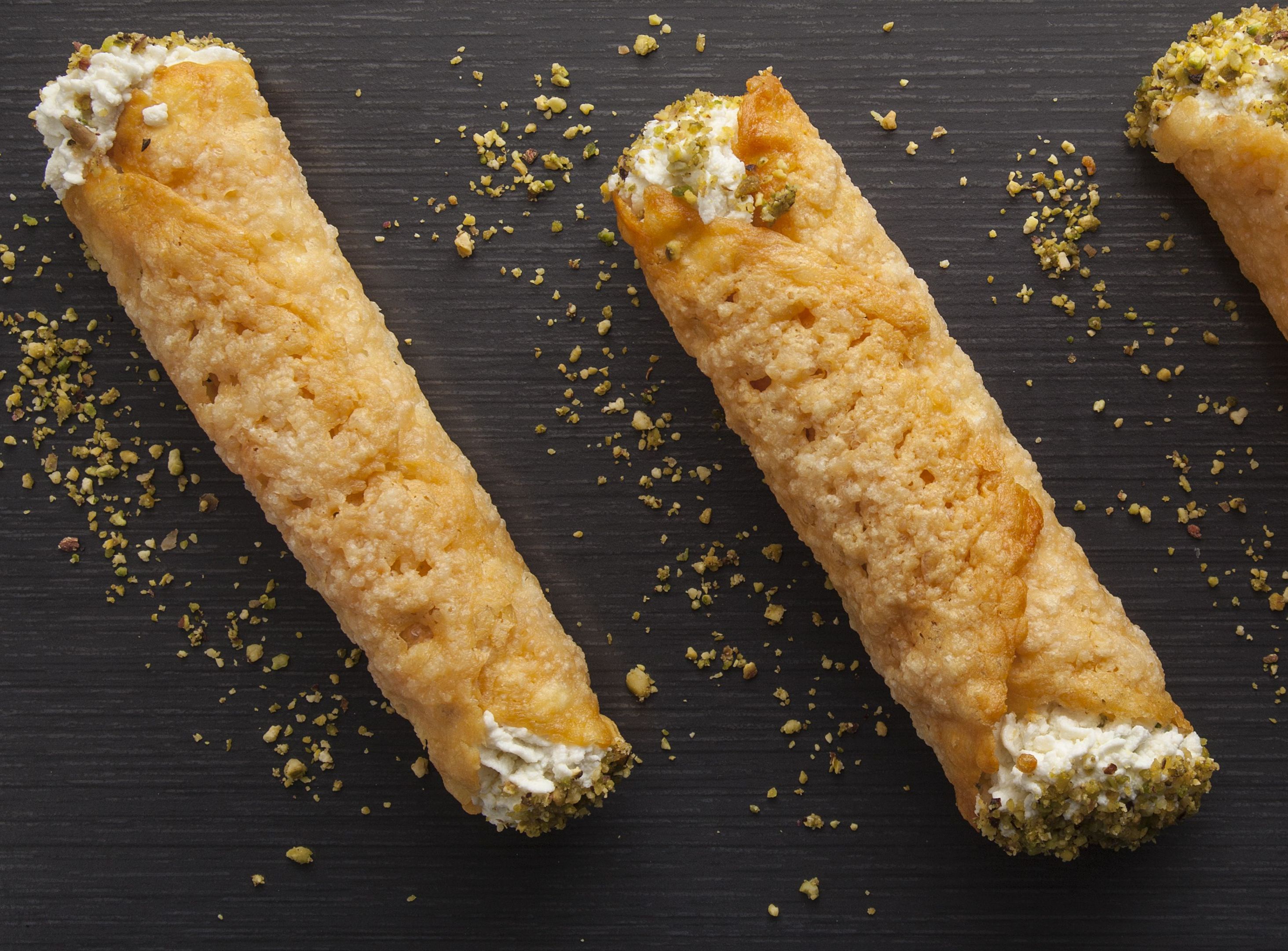 Αμέσως μόλις βγάλουμε τους κύκλους παρμεζάνας από τον φούρνο, τους τυλίγουμε πάνω σε πλάστη ή άλλο κυλινδρικό αντικείμενο για να πάρουν το σχήμα ρολού. Ανακατεύουμε σε ένα μπολ, με έναν αβγοδάρτη, το ανθότυρο, το ξύσμα λεμονιού, το λάδι, το σχινόπρασο και 1 κ.γ. από τα φιστίκια. Θα πρέπει να έχουμε μια απαλή κρέμα. Βάζουμε το μείγμα σε ένα κορνέ και γεμίζουμε τα ρολά. Πασπαλίζουμε τις άκρες με τα υπόλοιπα φιστίκια και σερβίρουμε.