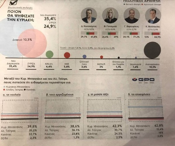 Σύμφωνα με δημοσκόπηση της GPO για λογαριασμό της εφημερίδας «Παραπολιτικά», στην πρόθεση ψήφου, η ΝΔ συγκεντρώνει 35,4%, ο ΣΥΡΙΖΑ 24,9%, το ΚΙΝΑΛ 6,4%, το ΚΚΕ 5,8%, η Ελληνική Λύση 3,6%, το ΜέΡΑ25 3%, ενώ οι αναποφάσιστοι βρίσκονται στο 10,5%.