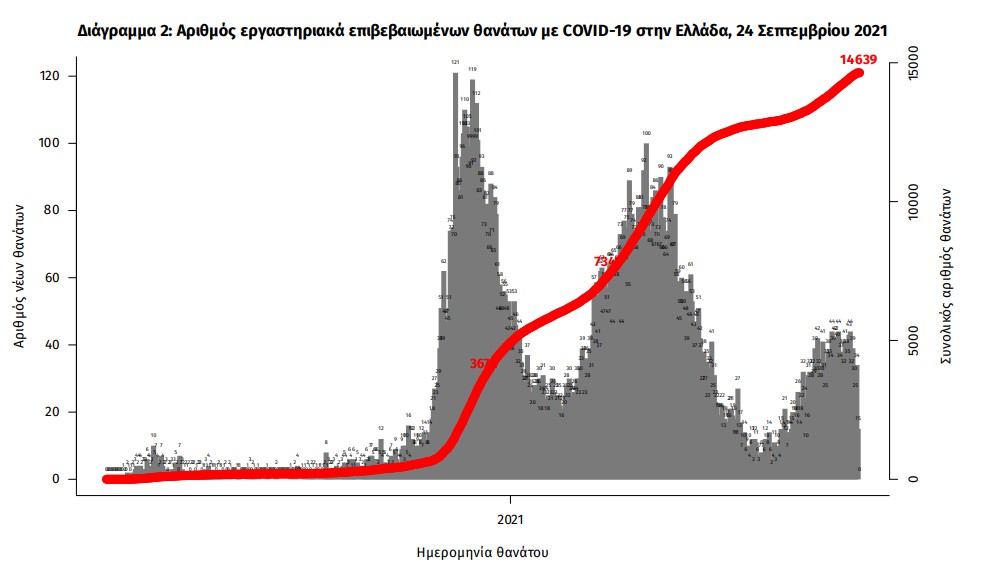 Οι νέοι θάνατοι ασθενών με COVID-19 είναι 33, ενώ από την έναρξη της επιδημίας έχουν καταγραφεί συνολικά 14.639 θάνατοι. Το 95.4% είχε υποκείμενο νόσημα ή/και ηλικία 70 ετών και άνω.