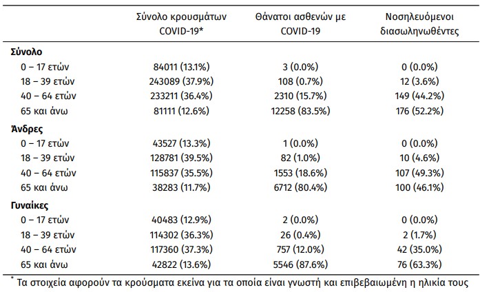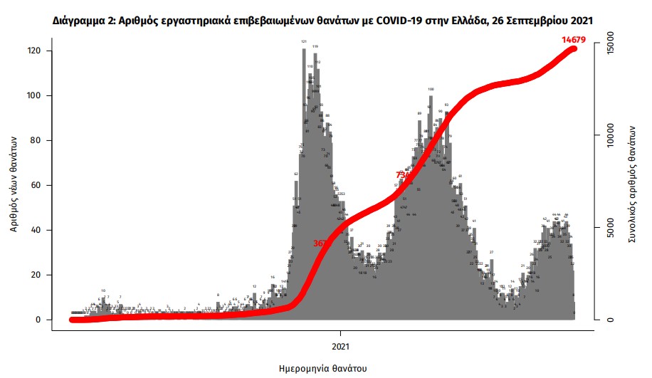 Οι νέοι θάνατοι ασθενών με COVID-19 είναι 24, ενώ από την έναρξη της επιδημίας έχουν καταγραφεί συνολικά 14.679 θάνατοι. Το 95.4% είχε υποκείμενο νόσημα ή/και ηλικία 70 ετών και άνω.