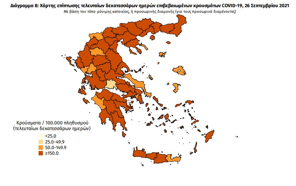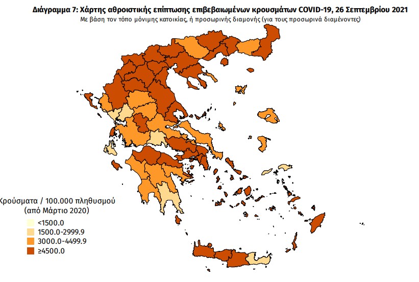 Με βάση τα επιβεβαιωμένα κρούσματα των τελευταίων 7 ημερών, 111 θεωρούνται σχετιζόμενα με ταξίδι από το εξωτερικό και 3.609 είναι σχετιζόμενα με ήδη γνωστό κρούσμα.