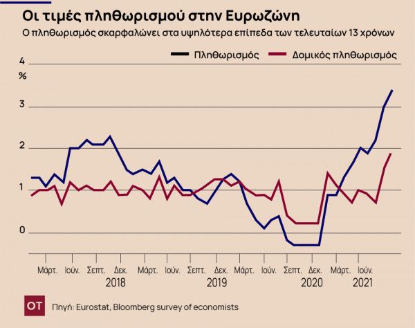Αναλυτές εκτιμούν ότι με τις τιμές του φυσικού αερίου να καταρρίπτουν το ένα ανοδικό ρεκόρ μετά το άλλο, και τα προβλήματα στον εφοδιασμό να επηρεάζουν τα πάντα, από την παραγωγή αυτοκινήτων έως την κατασκευή υπολογιστών, ο πληθωρισμός θα μπορούσε να φτάσει το 4% μέχρι το τέλος του έτους. Το ποσοστό αυτό είναι διπλάσιο από τον στόχο της ΕΚΤ.