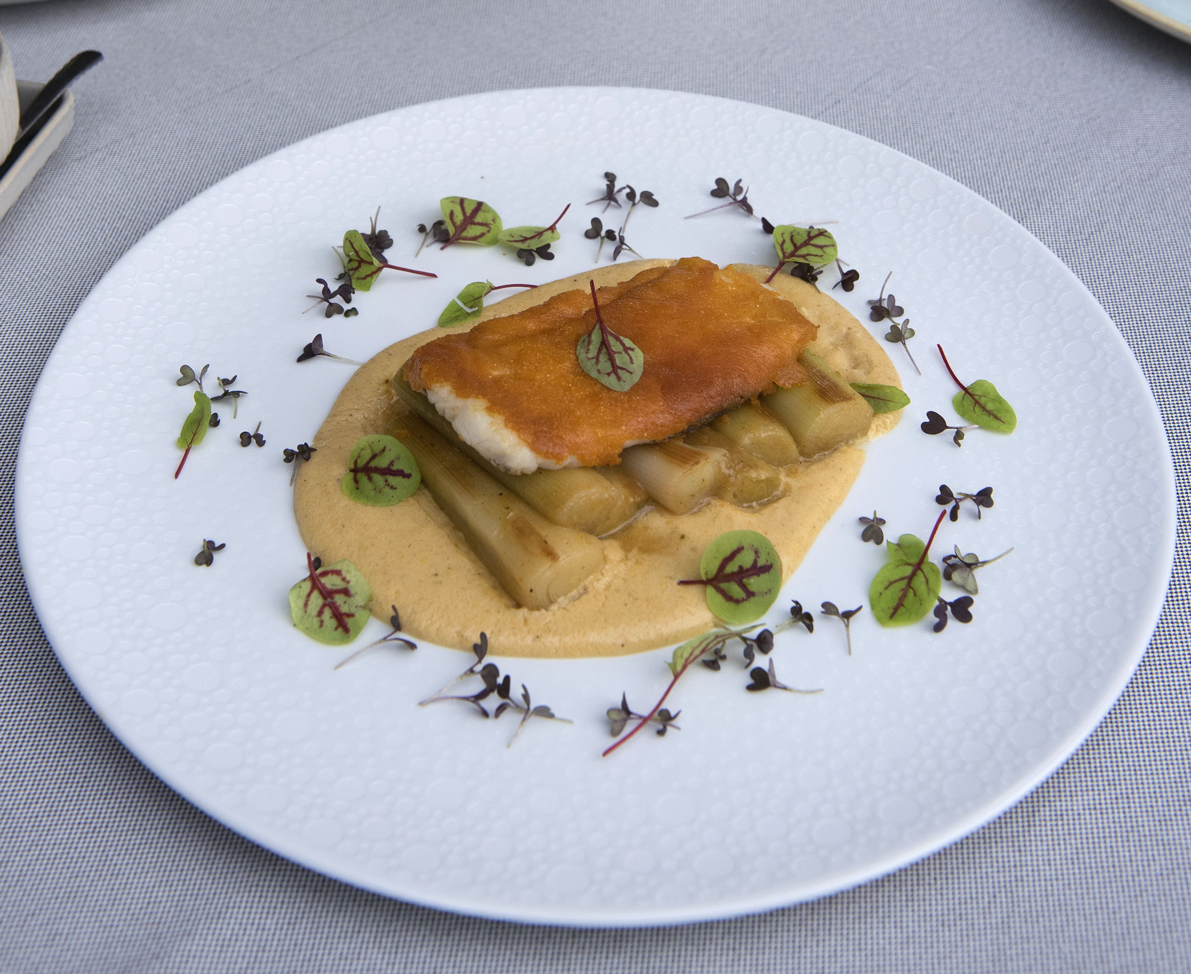 Βγάζουμε προσεκτικά με μια τσιμπίδα λεπτή (ακόμη και των φρυδιών τα τσιμπιδάκια κάνουν, αλλά υπάρχουν πλέον στο εμπόριο ειδικές τσιμπίδες μαγειρικής) τα κόκαλα από τα φιλεταρισμένα ψάρια. Καθαρίζουμε τα πράσα και τα κόβουμε σε ροδέλες πάχους 5 εκ. Ζεματίζουμε τα πράσα σε μια κατσαρόλα με νερό που βράζει για 2 λεπτά να φύγει η αψάδα τους. Τα βγάζουμε, τα στραγγίζουμε και τα σοτάρουμε στο ελαιόλαδο σε μια κατσαρόλα μέχρι να πάρουν χρώμα. Επειτα προσθέτουμε τον ζωμό ψαριού και τα αφήνουμε σε χαμηλή φωτιά ώσπου να μαλακώσουν ελαφρώς, περίπου 15 λεπτά.