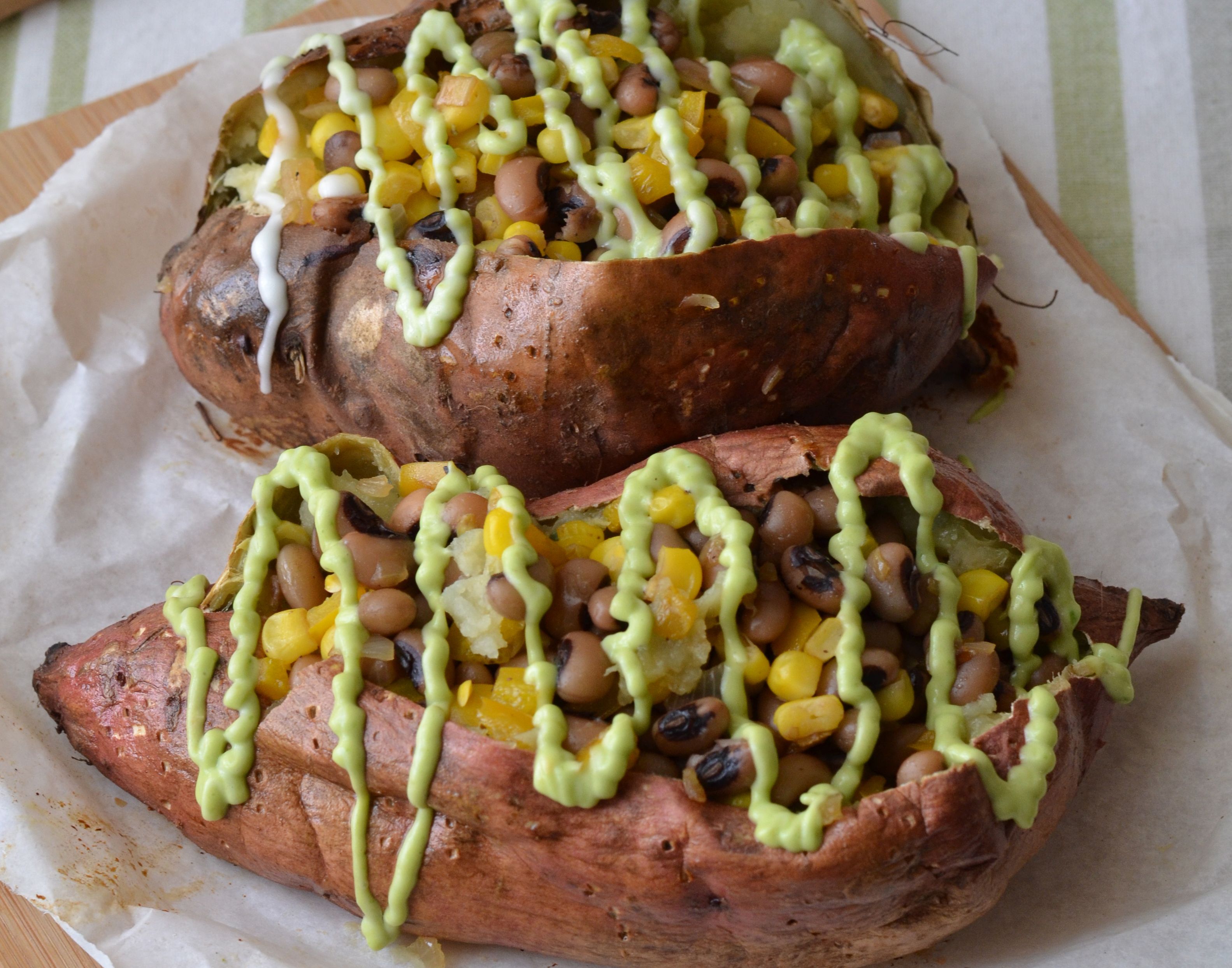 Σε ένα αντικολλητικό τηγάνι σοτάρουμε στο λάδι το κρεμμύδι με την πιπεριά για 5 λεπτά, προσθέτουμε το καλαμπόκι, το κάρι, αλατοπιπερώνουμε και αφήνουμε για άλλα 2-3 λεπτά. Ανοίγουμε τις γλυκοπατάτες στα δύο, τις γεμίζουμε με το μείγμα φασολιών και ξαναβάζουμε τα 4 κομμάτια γλυκοπατάτας στον φούρνο στους 180οC για άλλα 20 λεπτά.