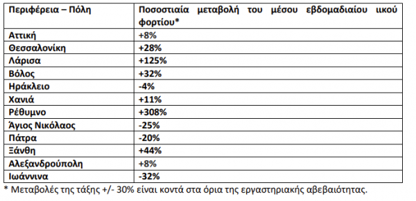 Καθαρά αυξητικές τάσεις παρατηρήθηκαν στην Ξάνθη (+44%), στη Λάρισα (+125%) και στο Ρέθυμνο (+308%), ενώ οριακές ήταν οι αυξήσεις που παρατηρήθηκαν στα Χανιά (+11%), στη Θεσσαλονίκη (+28%) και στο Βόλο (+32%). Οριακά πτωτικές τάσεις παρατηρήθηκαν σε τρείς από τις δώδεκα (3/12) περιοχές του ΕΔΕΛ και συγκεκριμένα στην Πάτρα (-20%), στον Άγιο Νικόλαο