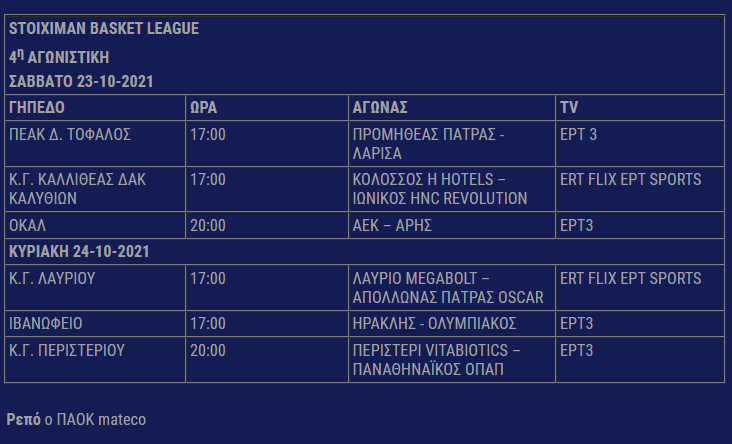 Την 4η αγωνιστική το Ηρακλής – Ολυμπιακός ορίστηκε για την Κυριακή 24/10 στις 17:00 (ΕΡΤ 3), ενώ την ίδια μέρα, αλλά στις 20:00, θα πραγματοποιηθεί το Περιστέρι – Παναθηναϊκός (ΕΡΤ 3).