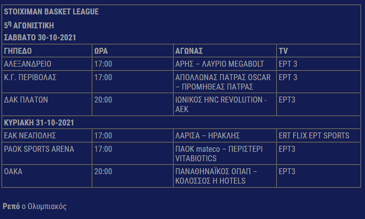 Την 5η αγωνιστική ο Ολυμπιακός έχει ρεπό, ενώ ο Παναθηναϊκός θα παίξει με τον Κολοσσό στο ΟΑΚΑ, σε ένα ματς που θα διεξαχθεί στις 31/10 στις 20:00 και θα μεταδοθεί τηλεοπτικά από την ΕΡΤ 3.