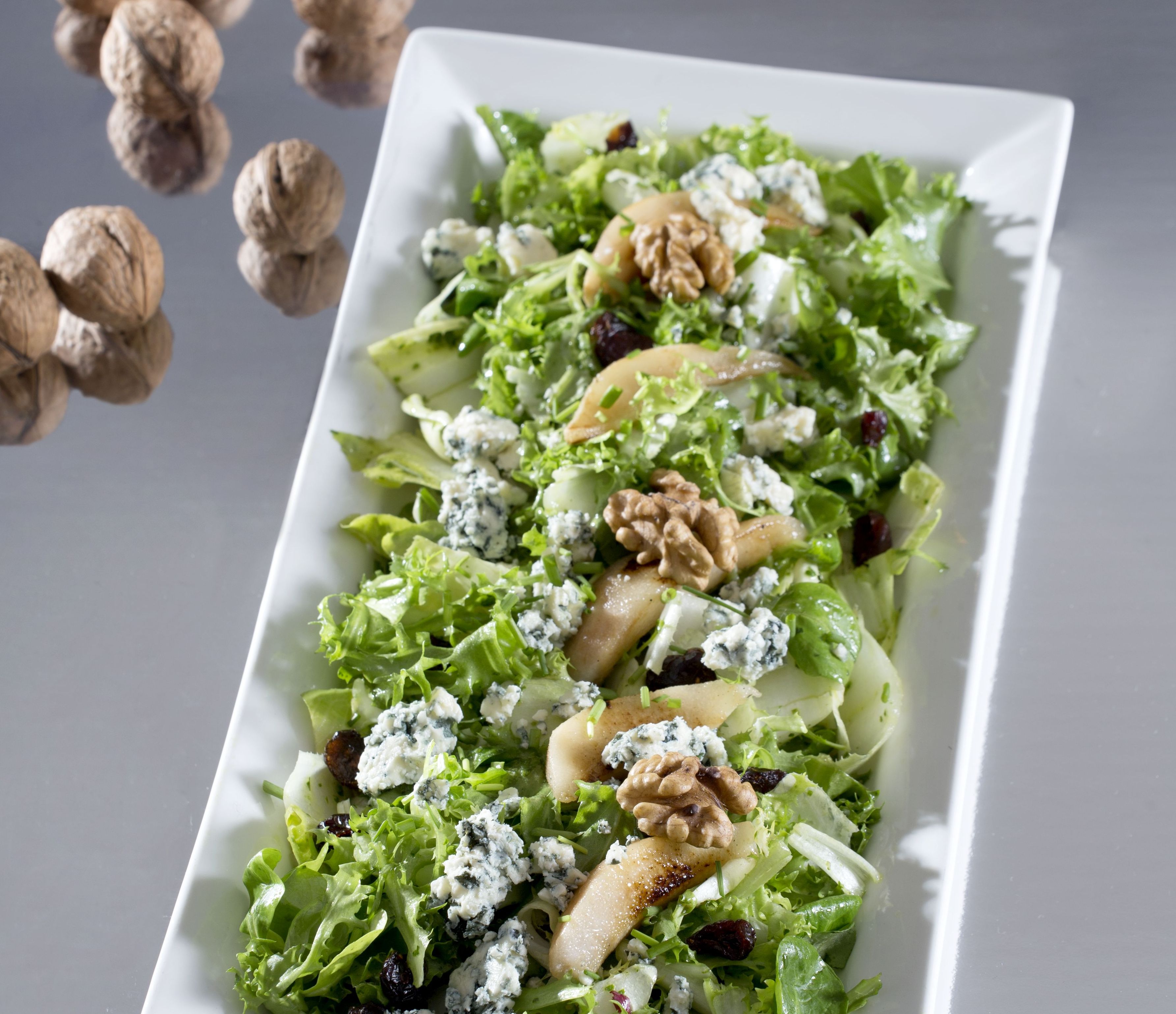 Κρατάμε 1-2 κ.σ. από το ντρέσινγκ και ρίχνουμε το υπόλοιπο στη σαλάτα. Βάζουμε από πάνω τα αχλάδια, το μπλε τυρί σπασμένο με τα χέρια, το σχινόπρασο, τα φύλλα μαϊντανού και διακοσμούμε με τα ολόκληρα καρύδια και προσθέτουμε το υπόλοιπο ντρέσινγκ.