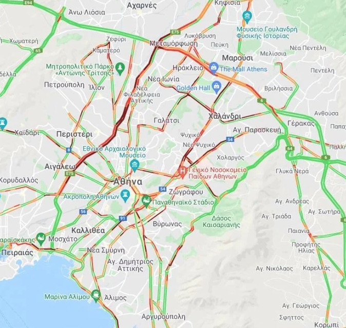 Αναλυτικότερα, μεγάλο μποτιλιάρισμα υπάρχει στον Κηφισό και στα δύο ρεύματα από νωρίς το πρωί της Δευτέρας. Όπως φαίνεται στον χάρτη της Google, η κίνηση ξεκινά από το ύψος της Κηφισιάς και φτάνει μέχρι τον Ρέντη, τόσο στην άνοδο όσο και στην κάθοδο.