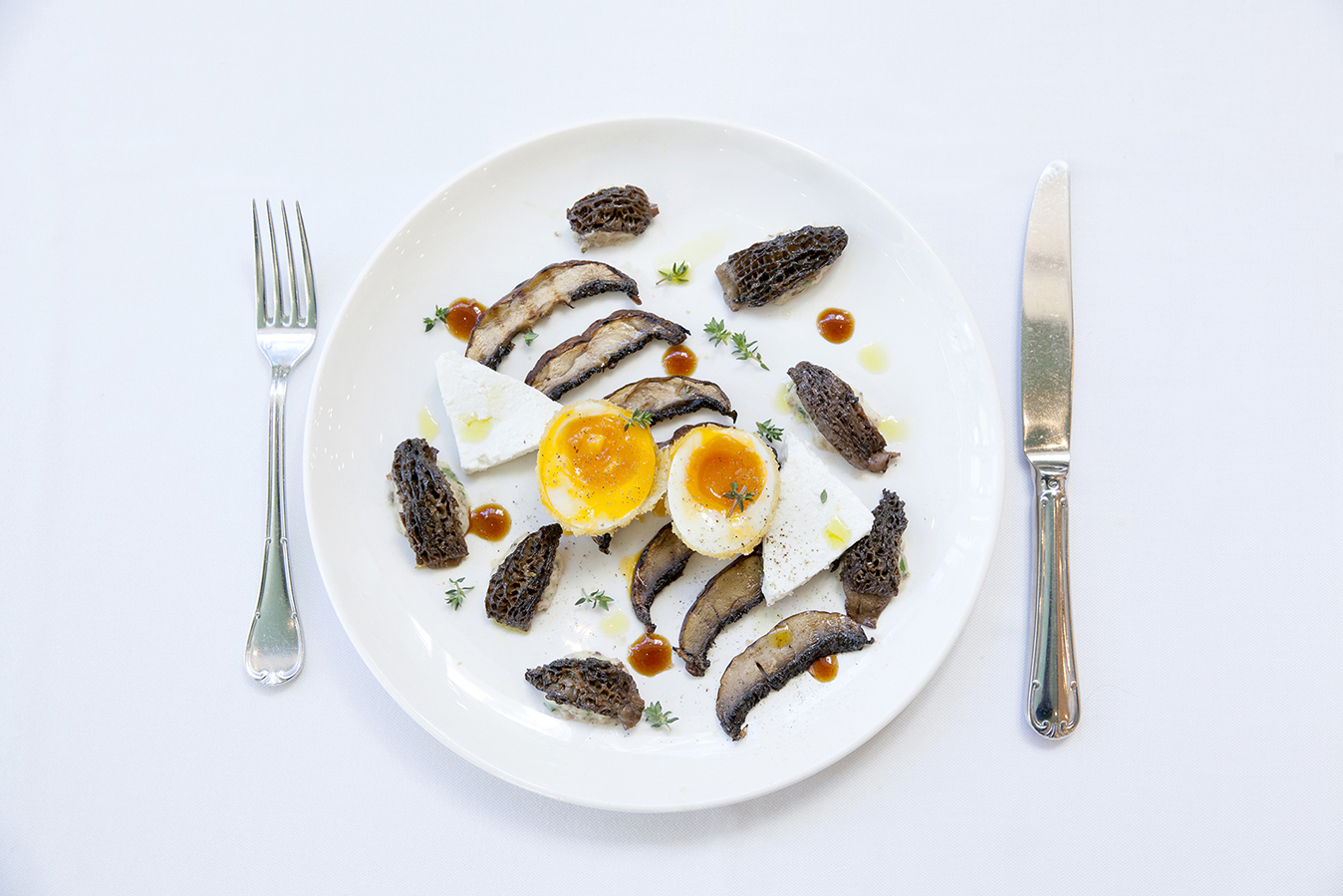 Μανιτάρια: Σε ένα τηγάνι γκριλ βάζουμε λίγο ελαιόλαδο και μια σκελίδα σκόρδο. Κόβουμε σε φέτες τα πορτομπέλο, αλατοπιπερώνουμε και τα ψήνουμε 3 λεπτά από κάθε πλευρά. Τα βγάζουμε. Συνεχίζουμε με τα σαμπινιόν ή τις μορχέλες. Τα ψήνουμε περίπου 3 λεπτά από κάθε πλευρά και τα βγάζουμε. Τηγανίζουμε τα ήδη παναρισμένα αβγά στους 170°C, να πάρουν χρώμα, για 3 λεπτά σε φριτέζα ή κατσαρόλα.