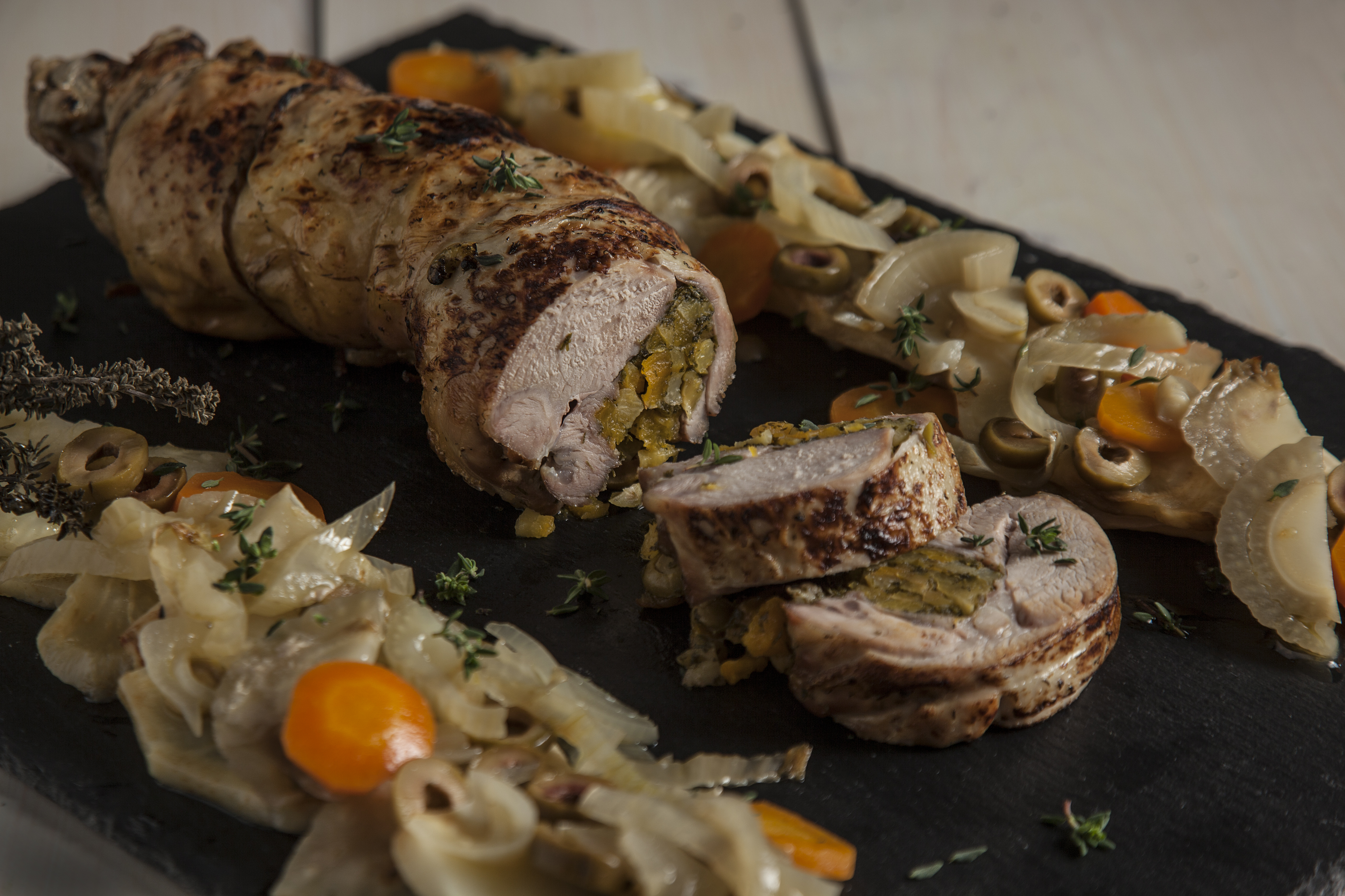 Σκεπάζουμε το ταψί με λαδόκολλα και τη στερεώνουμε με αλουμινόχαρτο. Ψήνουμε στον φούρνο για περίπου 45′ και ελέγχουμε ανά διαστήματα αν πρέπει να προσθέσουμε υγρά. Χαμηλώνουμε τη θερμοκρασία στους 160 °C και αφήνουμε να σιγοψηθεί για περίπου 1,5 ώρα ακόμα. Αν χρειαστεί προσθέτουμε λίγο νερό. Το τελευταίο τέταρτο το ξεσκεπάζουμε για να πάρει χρώμα. Βγάζουμε από τον φούρνο, το μεταφέρουμε σε πιατέλα και κόβουμε σε φέτες.