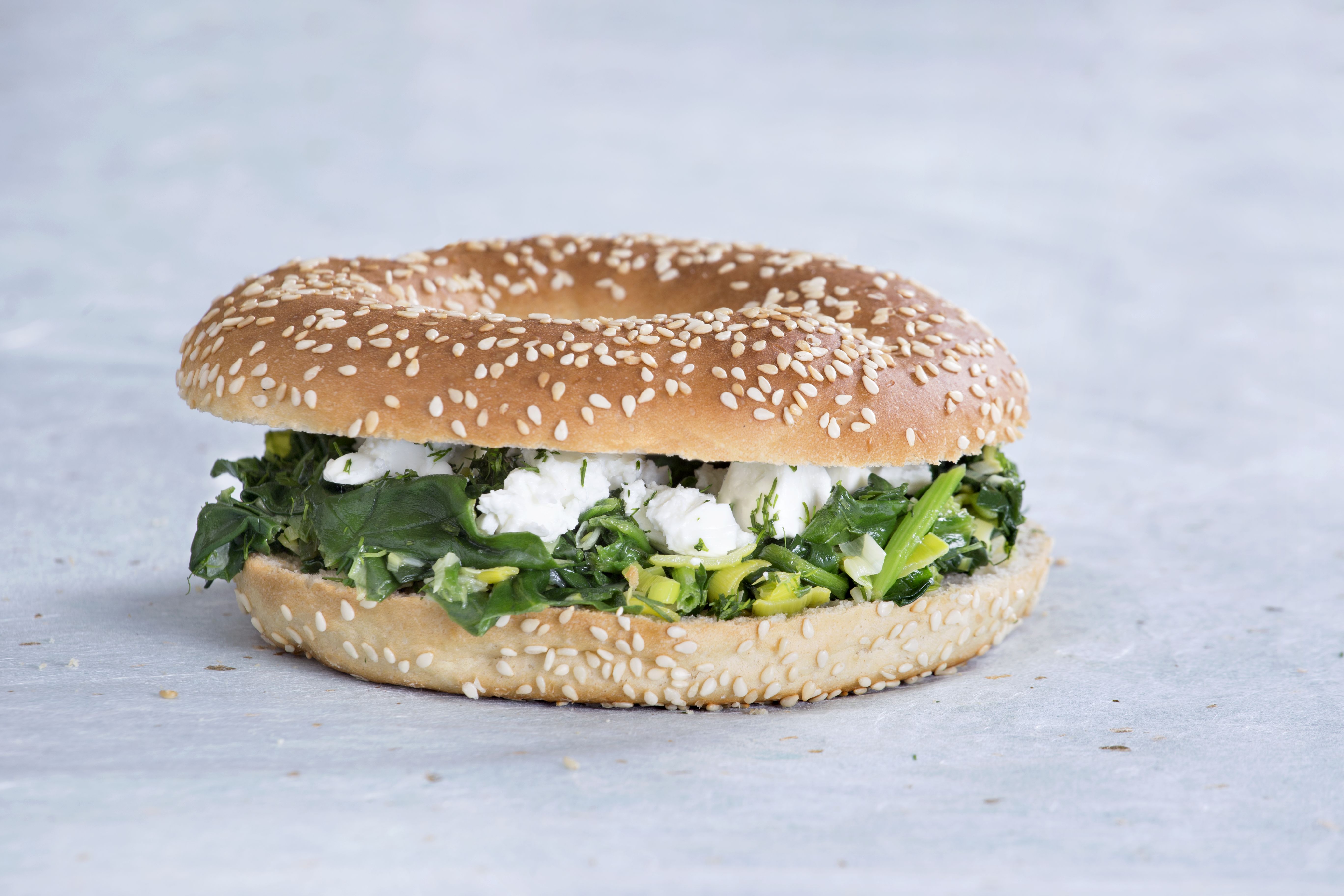 Με ένα καλό μαχαίρι, κόβουμε εγκάρσια τα κουλούρια. Ψήνουμε την εσωτερική τους πλευρά σε ένα ζεστό τηγάνι για 3-4 λεπτά, να κάνει λίγο κρούστα. Μοιράζουμε μια πλούσια στρώση από το μείγμα με τα χόρτα και από πάνω τη φέτα. Κλείνουμε.