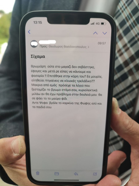 Όπως μπορείτε να δείτε, το νέο απειλητικό μήνυμα γράφει (σ.σ. με την ορθογραφία και τη σύνταξη που εστάλη): «Βρωμιάρη ούτε στο μαγαζί δεν σεβάστηκε, έφαγες και μετά ρε είπες να κάνουμε και φασαρία!! Επιτέθηκε στην κόρη του? Εε μουρλέ, αληθεύει πηγαίνεις σε κλινικές τρελάδικο??