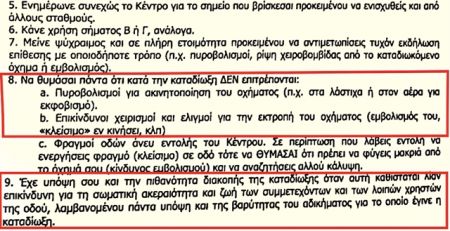 «Κατά την καταδίωξη δεν επιτρέπονται πυροβολισμοί για ακινητοποίηση του οχήματος, παραδείγματος χάριν στα λάστιχα ή στον αέρα για εκφοβισμό. Απαγορεύονται επικίνδυνοι χειρισμοί και ελιγμοί για την εκτροπή του οχήματος. Εξασφάλισε την επικοινωνία σου με το Κέντρο ρυθμίζοντας την ένταση του ασυρμάτου και παίρνοντας μαζί τον φορητό ασύρματο (εάν πρόκειται για πεζή καταδίωξη). Εχε υπ’ όψιν σου και την πιθανότητα διακοπής της καταδίωξης όταν αυτή καθίσταται επικίνδυνη για τη σωματική ακεραιότητα των συμμετεχόντων και των λοιπών χρηστών της οδού, λαμβανομένης πάντα υπ’ όψιν και της βαρύτητας του αδικήματος για το οποίο έγινε η καταδίωξη».