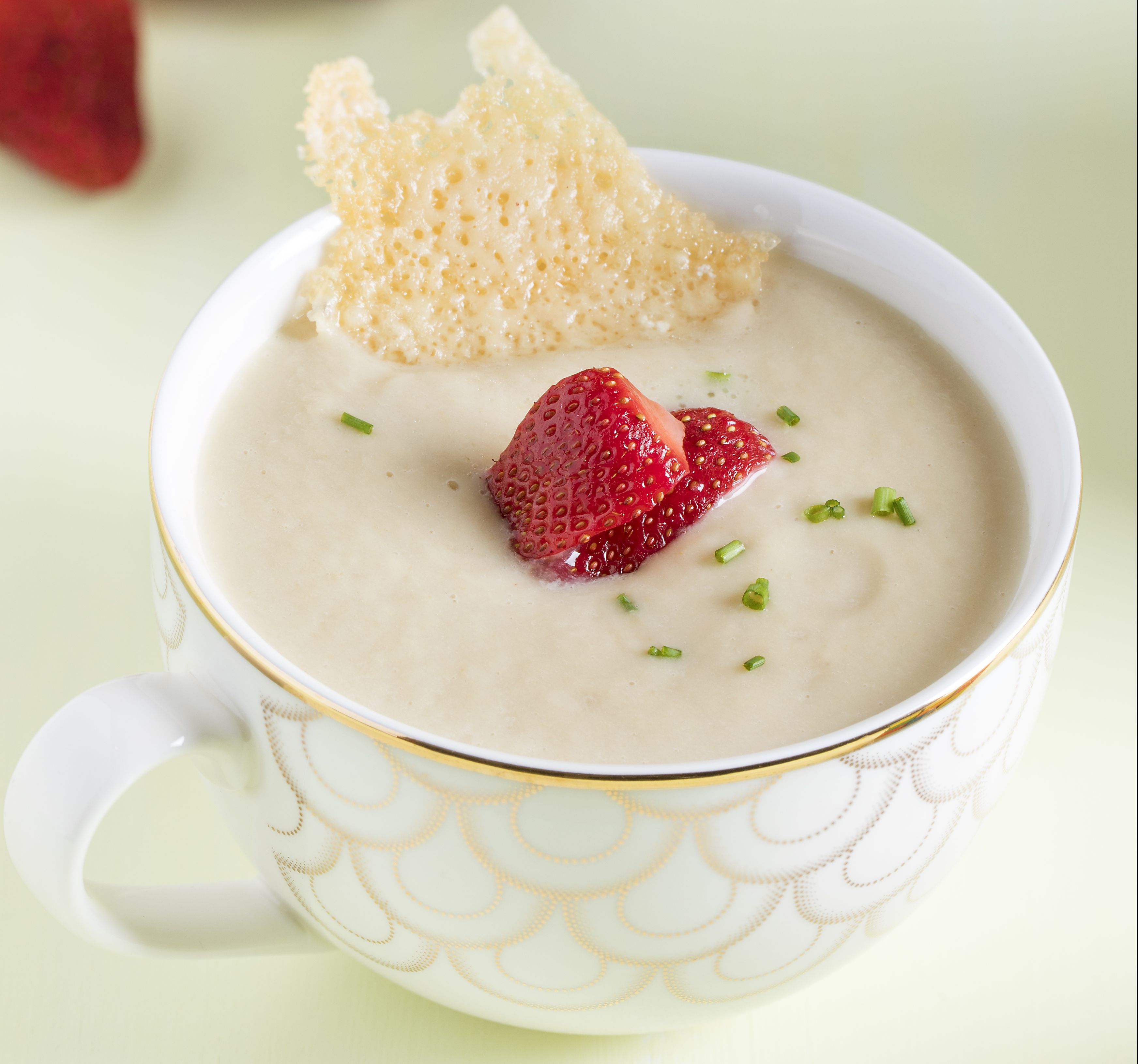 Κόβουμε σε μικρές ροδέλες το πράσο και το τσιγαρίζουμε σε μια κατσαρόλα με 2 κ.σ. ελαιόλαδο, μέχρι να μαλακώσει. Προσθέτουμε τη σελινόριζα και το αχλάδι και τσιγαρίζουμε για περίπου 1 λεπτό. Ρίχνουμε τον ζωμό και το γάλα και αφήνουμε να σιγοβράσει μέχρι να μαλακώσουν τα υλικά, περίπου 30 λεπτά. Τα αφαιρούμε με μια τρυπητή κουτάλα και τα πολτοποιούμε, μαζί με την κρέμα γάλακτος, στο μπλέντερ, μέχρι να αποκτήσουν ωραία, βελούδινη υφή. Ψήνουμε σε ένα αντικολλητικό τηγάνι την παρμεζάνα μέχρι να γίνει τραγανή. Αποσύρουμε από τη φωτιά και βγάζουμε με προσοχή την παρμεζάνα από το τηγάνι. Σερβίρουμε τη σούπα και βάζουμε από πάνω τις φράουλες και την παρμεζάνα. Γαρνίρουμε με το σχοινόπρασο και προσθέτουμε μερικές σταγόνες αγουρέλαιο σε κάθε πιάτο.