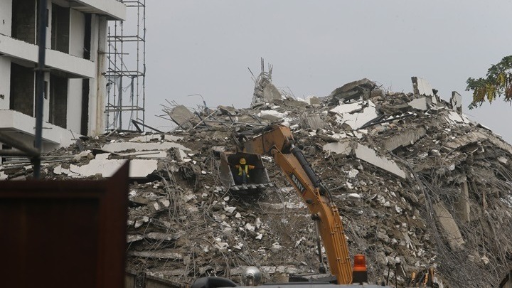 Οι υπηρεσίες διαχείρισης εκτάκτων καταστάσεων χρησιμοποίησαν εκσκαφείς για να απομακρύνουν όγκους από τσιμέντο από το σημείο, στη συνοικία Ικόγι, αφότου καταρρακτώδεις βροχές έπληξαν το Λάγκος κατά τη διάρκεια της νύχτας, με αποτέλεσμα να σταματήσουν οι έρευνες.
