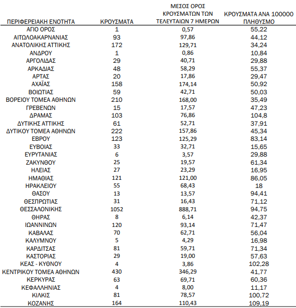 Την ίδια στιγμή, 12 περιοχές καταγράφουν τριψήφιο αριθμό κρουσμάτων.