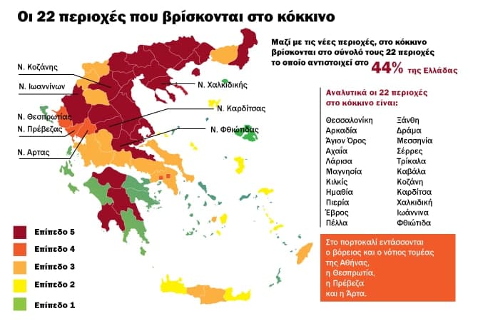 Την ίδια ώρα ακόμη 5 περιοχές θα ενταχτούν στο κόκκινο του επιδημιολογικού χάρτη μετά από εισήγηση της επιτροπής επιδημιολόγων. Μαζί με αυτές οι περιοχές που βρίσκονται στο κόκκινο είναι 22 στον αριθμό, το οποίο αντιστοιχεί στο 44% της Ελλάδας.